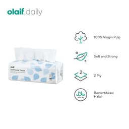 Olaif Daily Soft Facial Tissue merupakan perpaduan sempurna antara kelembutan dan kekuatan. Terbuat dari serat alami yang diproses secara higienis tanpa bahan kimia, untuk menghasilkan serat lembut yang berkualitas tinggi. Tisu berlapis 2 dan tahan lama ini cocok dan aman digunakan setiap hari pada wajah, tangan dan tubuh, serta berbagai permukaan lainnya. Tekstur yang lembut dan memanjakan, membuat kulit terasa halus dan nyaman. Selain itu, tisu ini juga berdaya serap tinggi dan tidak mudah robek sehingga dapat digunakan untuk berbagai kebutuhan. Virgin Pulp Berasal dari sumber botanikal dengan serat alami, Soft Facial Tissue mengandung serat lembut berkualitas tinggi. Chemical Free Tidak mengandung bahan pewangi, klorin, bahan pewarna, atau bahan kimia lainnya. Aman digunakan pada wajah, tangan dan tubuh, serta berbagai permukaan lainnya. Ultra Soft Texture Dengan tekstur ekstra lembut menjadikan kulit anda terasa halus dan nyaman. Memberikan anda kualitas dan perlindungan dengan sensasi kenyamanan. Durable Strength & Highly Absorbent Tebal dan kuat, cocok digunakan pada wajah, tangan dan tubuh, serta permukaan lainnya. Berdaya serap tinggi untuk berbagai kegunaan. Dimensi Tisu : 17.5cm x 19cm --- Ijin Edar KEMENKES RI PKD 10102121549 Sertifikat Halal LPPOM MUI ID00310000411561021